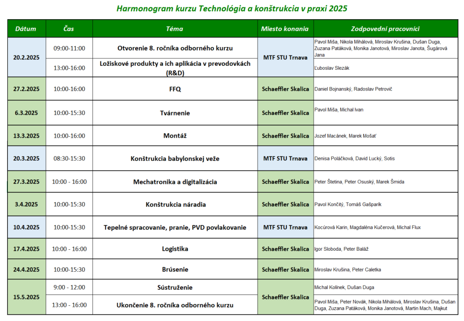 Ústav výrobných technológií MTF STU so sídlom v Trnave v spolupráci s firmou Schaeffler Skalica, spol. s r. o. organizuje v LS ak. roka 2024/2025 kurz „Technológia a konštrukcia v praxi“, ktorý bude prebiehať kombinovane v priestoroch MTF STU a spoločnosti Schaeffler Skalica. Je to modul vzdelávacích aktivít, ktorý je zameraný na intenzívnejšie prepojenie formálneho vzdelávania so vzdelávaním neformálnym, formou riešenia projektových úloh pod vedením odborníkov z praxe priamo v prostredí spoločnosti Schaeffler. Študenti počas 12 stretnutí nadobudnú nové poznatky a skúsenosti, budú riešiť reálne a praktické zadania, získajú informácie o fungovaní procesov v podniku, zoznámia sa s technológiami budúcnosti, ďalej sa naučia komunikovať a pracovať v tíme a zdokonalia sa v prezentačných zručnostiach.
