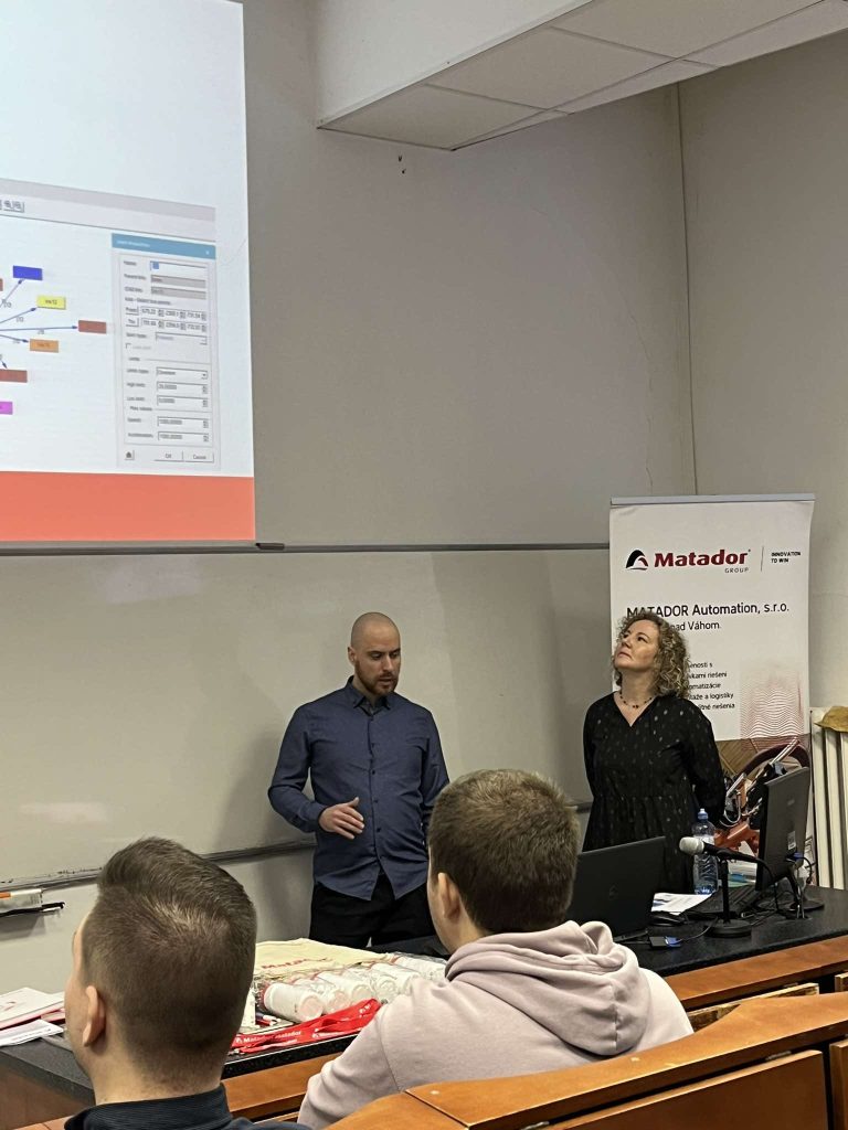 Dňa 19.11.2024 sa v rámci predmetov Projektovanie výroby a Technológia tvárnenia uskutočnili prednášky na tému „Simulácia priemyselných robotov“ a „Digitálny podnik v podmienkach MATADOR Automation“, ktorú prezentovali Ing. Silvia Brožeková a Ing. Milan Troška. V úvode prednášky Ing. Silvia Brožeková predstavila oblasti, v ktorých firma pôsobí a uviedla ďalšie možnosti spolupráce, napr. možnosti realizácie letných brigád, odborných stáží, či participácii na riešení záverečných prác.