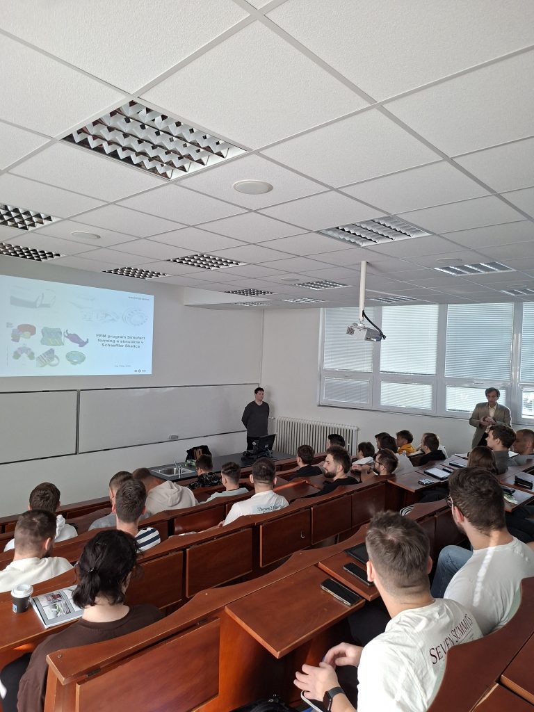 Dňa 04.11.2025 sa uskutočnila v rámci predmetu Teória tvárnenia, prednáška na tému „Modelovanie a simulácia v softvéri Simufact Forming“. Prednáška bola určená študentom inžinierskeho stupňa štúdia, pre študijné programy Výrobné technológie a výrobný manažment a Počítačová podpora výrobných technológií.  Prednášku realizoval Ing. Peter Mičic zo spoločnosti Schaeffler Skalica, spol. s r. o., Skalica, ktorá bola zameraná na využitie simulačných softvérov pri riešení návrhu procesov plošného tvárnenia, aplikáciou softvéru Simufact Forming. Tento softvér je využívaný vo firme na prediktívnu analýzu v procese prípravy výroby výtvarkov ako aj na následné riešenie problémov, vzniknutých v procese výroby. Ďalej predstavil aktuálne trendy v oblasti automobilového priemyslu, na ktoré spoločnosť Schaeffler reaguje návrhmi nových produktov, čo otvorilo zo strany študentov širokú diskusiu.