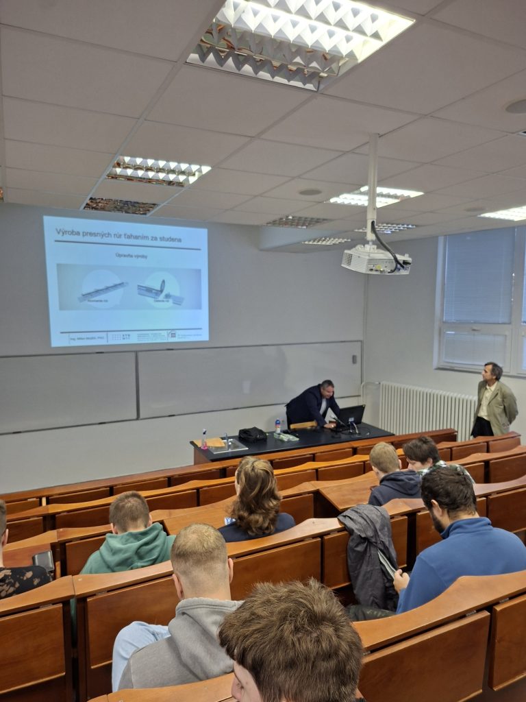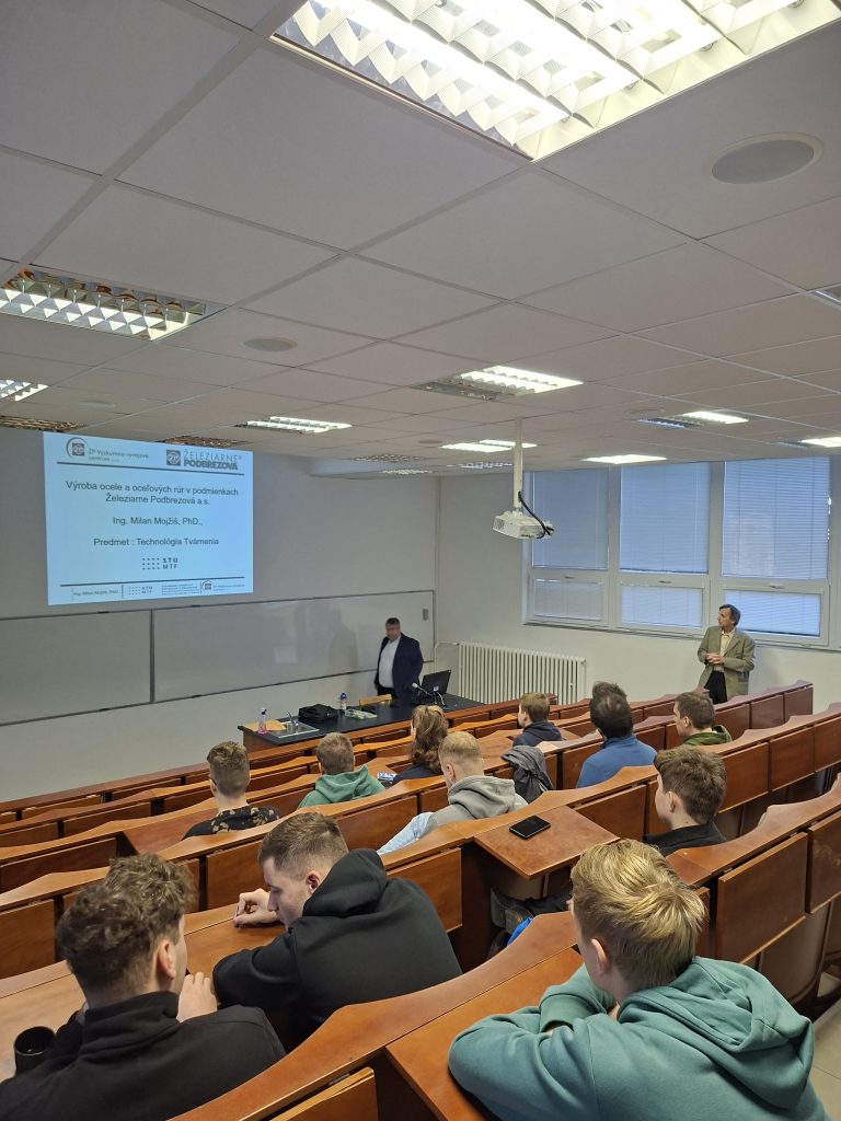 Dňa 05.11.2025 sa v rámci predmetov Technológia tvárnenia a Teória tvárnenia uskutočnila prednáška na tému „Výroba bezšvíkových rúr v spoločnosti Železiarne Podbrezová a. s.“, ktorú prezentoval Ing. Milan Mojžiš, PhD. z dcérskej firmy ŽP Výskumno-vývojové centrum spol. s r. o. Železiarní Podbrezová a. s. V rámci prednášky bola podrobne predstavená výroba bezšvíkových rúr od výroby ocele, výroby polotovarov, až po výrobu valcovaných rúr, výrobu presných ťahaných rúr spolu s následnou kontrolou a expedíciou. Časť prednášky bola venovaná využitiu simulačného softvéru DEFORM 3D pri riešení procesov valcovania rúr za tepla a ťahania rúr za studena. Prednáška bola doplnená o simulácie a videá, ktoré dopomohli k lepšiemu pochopeniu celého procesu výroby bezšvíkových rúr.