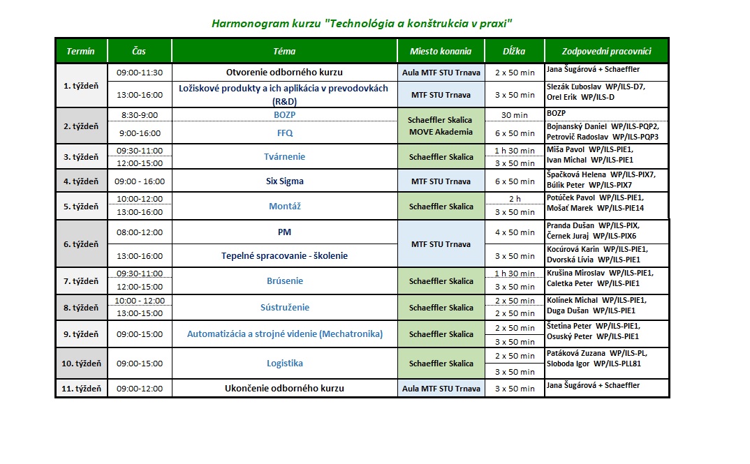 Ústav výrobných technológií MTF STU so sídlom v Trnave v spolupráci s firmou Schaeffler Skalica, spol. s r.o. organizuje v LS ak. roka 2021/2022 odborný kurz Technológia a konštrukcia v praxi, ktorý bude prebiehať kombinovane v priestoroch MTF STU a spoločnosti Schaeffler Skalica a bude zameraný na intenzívnejšie prepojenie teoretického vzdelávania so získavaním praktických skúseností z odboru štúdia formou riešenia projektových úloh pod vedením odborníkov z praxe.